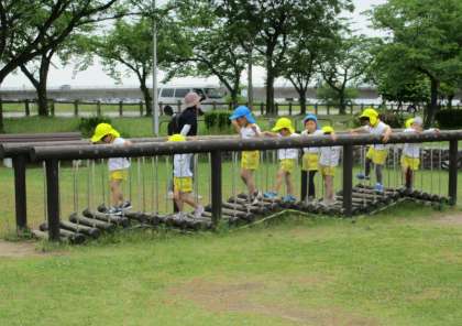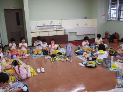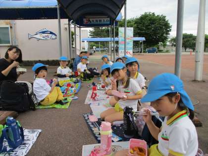 出発時の雨もあがり、水族館横の遊具で遊びました。大きな滑り台を滑ったり、吊り橋など遊び、「楽しかった。お腹すいたからお弁当食べよう」とお弁当を食べました。お家の方につくってもらったお弁当を食べ、おやつを食べました。