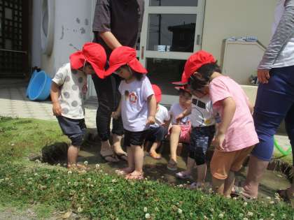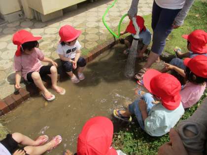 おうちの人に水遊び用に準備してもらったビーチサンダルを履くのが楽しみで「僕のサンダルは?」「ママに買ってもらったんだよ」と嬉しそうにしている子供たち。「今日はサンダル履いて外へ行ってみよう」と言うと「やったー」と自分のサンダルを手に玄関へ行く姿が見られました。初めて履く子も多く、実際履いてみると「うん?何だか変だな。うまく履けないな」と苦戦している子もいました。「ここにお父さん指とお母さん指で挟むよ」と教師が知らせると履くことができました。嬉しくて園庭を歩いたり、小山を上ったり「今度は水にぬらしてみよう」とみんなでサンダルの足を濡らし、水を溜めた場所でバシャバシャ水しぶきを上げたり楽しみました。濡れた足で砂場に行って足を砂で隠しては濡らしと繰り返し、水や砂の感触を味わうことができました。