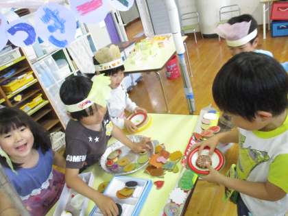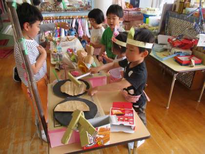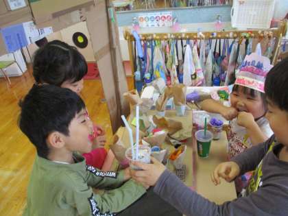うさぎ組では、これまでクレープ、クッキー、キャンディーのお店を開いて、店員さん、お客さん役になって交代しながら遊んできました。「いらっしゃいませ〜、おいしいクレープはいかがですか?」「いちごのクレープください」等と、やりとりを楽しんできました。かわいい店員さんに「また来てください」と言われると、ついつい何度も足を運んでしまい、おいしいスイーツを食べ過ぎてしまった先生たちです。たくさん遊んだので、みんなで作ったものを持ち帰りますので、またお家の人とお店屋さんごっこを楽しんでみてくださいね。