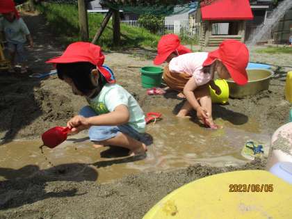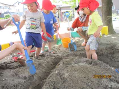 いざ、砂場に行くと「どうしよう」と止まってしまう子供たちでしたが、教師が穴を掘ったところに水をためると「すごーい」と興味津々に見ていたので、「一緒に穴掘ったらもっと水たまるかな。手伝ってほしいな」というと「わかった」と張り切って穴を掘り始めました。その中に水をバケツで運んで流すと「わあ、川みたいになってきた」と川をつくることになりました。どんどん長い川でき水が流れると履いていたサンダルも脱ぎ捨て、素足で入って「冷たいね、気持ちいいね」と初めてのどろんこ遊びを楽しむことができました。今後も、この季節ならではの遊びを友達や教師と一緒に満喫したいと思います。