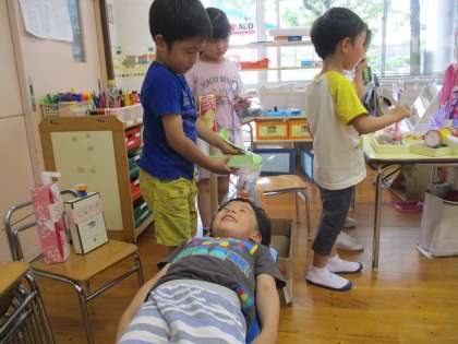 子供たちが作った髪飾りや、美容院で見た経験から、シャンプーをして髪を乾かしたり、髪飾りを付けたりして楽しんでいます。また、厚紙で作ったハサミで髪を切る真似をしながら「前髪はどうしますか?」「少し切ってください」と会話が弾んでいます。
