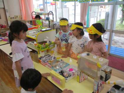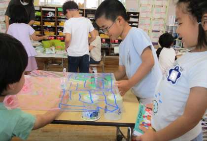 また、迷路を書くのが得意な友達が作った迷路に磁石を動かして進めています。友達同士で競争になったり、反対のルートを通ったりしています。また、ジュース屋さんでは、タピオカやレモネード、いろいろな味のジュースを売り買いしている子供たちです。友達と必要なものを相談して作りながら、遊びを楽しんでいきたいと思います。