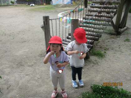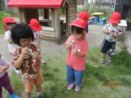 シャボン玉をして遊びました。シャボン玉をした経験がない子が多く見られました。そこで、はじめは、吹き口に口をつけずに吹く子や力強く吹く子がいた中「そーっと吹いてみよう」「優しく吹いたらどんなシャボン玉ができるのかな」と話し少しずつ吹いてみました。だんだん、シャボン玉の大きさがわかったり、友達の吹いたシャボン玉を見て真似をしたりして遊ぶ姿が見られました。遊んだ後には「大きいシャボン玉できて楽しかった」「屋根の上までいったね」と楽しかったことを話していました。季節ならではの遊びを楽しんでいきたいと思います。