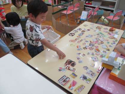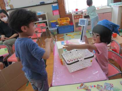 りす組ではお買い物ごっこをして遊んでいます。チラシの食べ物を切りカードにしてあげると「お買い物しよう」と遊びが始まりました。レジや買い物かごを準備すると「買い物に行こう」と楽しむ姿が見られるようになり、レジの人をしたり、買い物かごを持って品を選んだりする姿が見られました。遊んでいくうちに「いらっしゃいませ」「ありがとございます」「これください」とやり取りをするようになってきています。今後も、遊びの中で必要な言葉やルールを知らせ友達との関係も築いていけたらと思います。