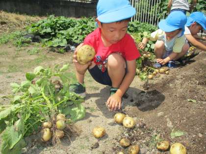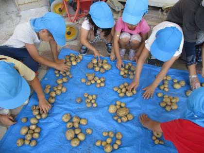 今日はジャガイモ掘りをしました。先週試しに掘ってみるとまだ少し小ぶりだったので、「大きくなっているかなぁ」と期待していた子供たちです。苗の下の方を引っ張るとゴロゴロと芋が連なって出てきました。期待していたほど大きくはありませんでしたが、食べやすいサイズ感です。牛乳パック当番の時のように、10個ずつ数えて山にしたところ、10個の山が25個!「250個だよ」と知らせると「えー!!!たくさんだね」と驚いていた子供たちです。虫食いの芋もありましたが、こんなに取れると思っていませんでしたが、まずまずの収穫でした!