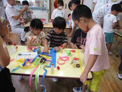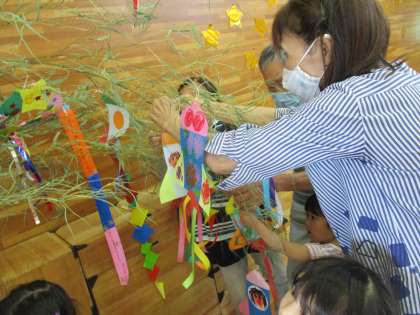 今日は、長寿会の方々と関係者評価委員会の方々をお招きして子供たちと一緒に「七夕子ども会」をしました。はじめに、吹き流しやロケットの飾りづくりをしました。長寿会の方や評価委員の皆さんは、同じグループになった子供たちに優しく声をかけたり見守ったりしてくださいました。完成した飾りを笹竹に付け、更に賑やかになりました。また、短冊に書いた願い事を聞き合いました。「子供たちが笑顔いっぱい楽しく過ごせますように」「元気に楽しい毎日を」と、子どもたちに向けた温かい願い事を書いてくださった方が多く、有難いことだなぁと嬉しく思いました。