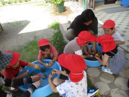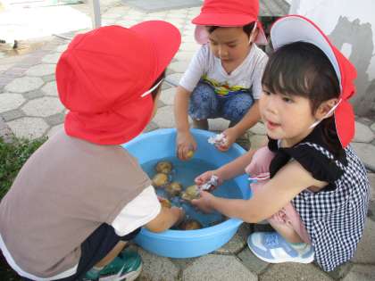 りす組はぞう組さんが育てたジャガイモを洗いました。園庭の畑で収穫したジャガイモを丁寧に洗いながら「このジャガイモがカレーライスの中に入るんだよ」というと「やった」と出来上がるカレーライスが楽しみな様子でした。「きれいになったジャガイモをうさぎ組さんが皮をむいてくれるよ」とうさぎ組さんにお願いしました。