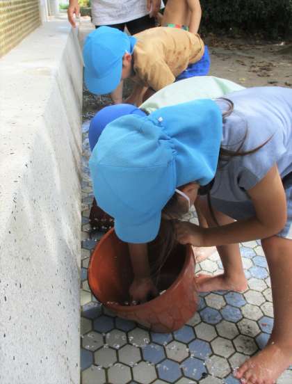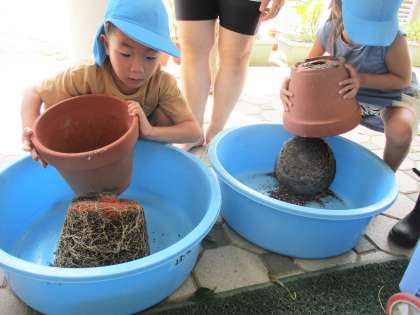 植木鉢をひっくり返してみると、ぎっしりの根っこに驚いていました。「固くてぎっしり!」「もしゃもしゃだ〜」と言いながらも根っこをほぐして楽しそうです。最後は、植木鉢をきれいに洗っておしまいです。