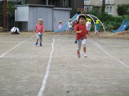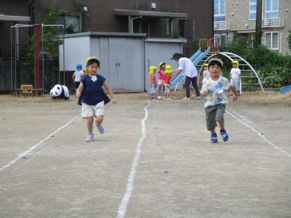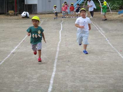 かけっこ、よーいドン!(4歳児) 公開日 2023/09/01 更新日 2023/09/01 今日のできごと 「おはようございます」と元気に登園してくる子供たち。持ち物の始末を終えると、外に出てかけっこをしました。「負けないぞ!」「一緒にゴールだったね」と楽しそうな子供たち。「なんか、体が重たいよ」なんて言葉も聞かれました。まだ暑さが続きそうなので、子供たちの体調を見ながら体を動かして遊んでいきたいと思います。