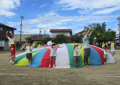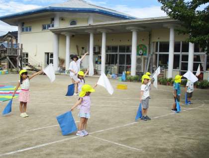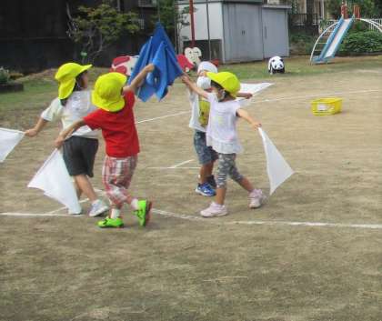 これまで運動会に向けて練習してきたバルーン演技を全園児と先生たちに見てもらいました。少し緊張した様子も見られましたが、大きなバルーンをピーンと張りながら指先を意識して歩く姿はとてもかっこよかったです。小旗は声を出してみんなでタイミングを合わせるともっとかっこよくなるね、と見ていた先生たちから教えてもらい、早速午後に練習をしました。運動会まで、もっと素敵な演技になるよう頑張っていきたいです。