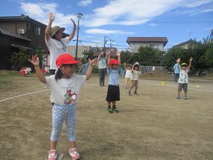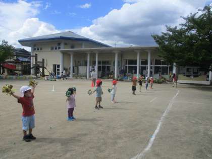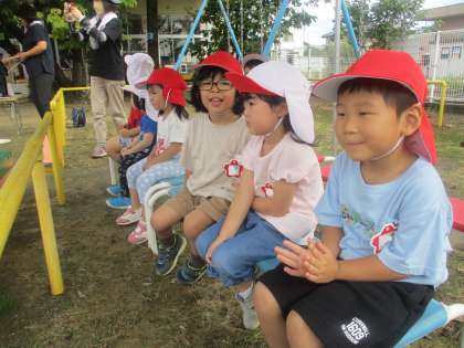毎日運動会に向けての活動をしています。「今日はバナナッキィ(曲名)する?」とリズムを踊ることを楽しみにしていたり、「かけっこ頑張って走るよ」と元気いっぱい走っています。日に日にリズムの掛け声が大きく言えたり、恥ずかしくて踊らなかった子が今では張り切って踊ったりと子供たちの頑張りが見られます。今日は、年長さんや年中さんの競技の応援もして、鼓隊演奏を見ながら太鼓をたたく真似をしたり、走る姿を見て「すごい速い」「かっこいい」と拍手を送る姿も見られました。