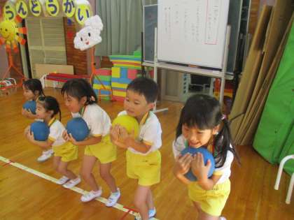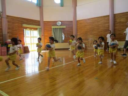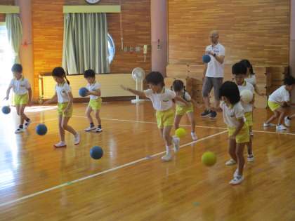 2学期が始まり、久しぶりの体操教室がありました。今日の体操教室はボール遊び。先生から「ボールは卵だからね。落とさないように運んでね」と言われ、頭の上や首の後ろにもち、慎重に運ぶ子供たちでした。友達とペアになってほほの間やお腹の間にボールを挟むと「面白いね」と顔を見合わせて笑う姿も見られました。ほかにも、ドリブルをしたり、ボールを上に投げてキャッチしたりなどボールを使ったいろいろな動きを楽しみながら教えてもらいました。