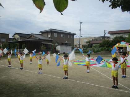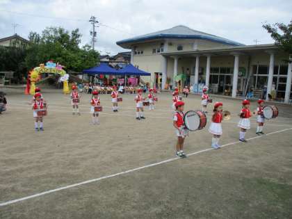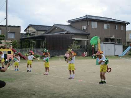 今日は運動会の予行練習をしました。本番のようにテントや入場門が準備され、音楽が流れていたり、本番の衣装を着たりしたことで、緊張した表情の子供たちでしたが演技が始まると張り切っている姿が見られました。予行練習後、ぞう組の子供たちは「今日はリレーでバトン落としたから、落とさないように練習だね」「綱引きはうさぎ組さんともっと練習しよう」と話していました。運動会まであと1週間、もっと楽しい運動会になるように頑張り、元気いっぱいむかえましょうね。PTAの役員の方々もお手伝いいただきありがとうございました。