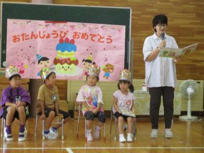 9月の誕生会をしました。入場時には友達や先生とタッチしながら「おめでとう〜」と何度も言われてとても嬉しそうでした。質問コーナーで好きな動物を聞かれると、「チーター」「ホワイトタイガー」「ユニコーン」「ぞう」と、それぞれ自分の言葉で答えていましたよ。他にも好きな食べ物や、好きなポケモンを質問され、上手に答えてくれました。