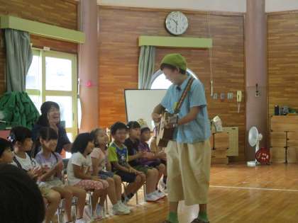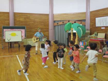 お楽しみコーナーでは「ゆきみだいふく」さんによる、歌遊びとパネルシアター!明日の十五夜に合わせて「♪月夜の晩に踊りだす〜○○(動物やクラス名)が浮かれて踊りだす〜♬」の曲で、動物の動きをしたり、クラスごとに自由に踊ったりして遊びました。子供たちののびのびとした表現に「A君、今の動き素敵だったよ!」「Y君の動き、面白いね」と、周りの友達も教師も笑顔になりました。今年の十五夜は満月と重なり、晴れていれば、とても美しいお月様が見えると思います。東の空に輝き始める19時から、南東の空へとのぼっていく21時ごろがお月見におすすめだそうですよ。ぜひ親子でお月見を楽しんでくださいね。