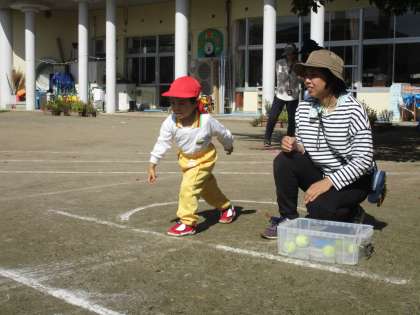 秋の体力測定をしました。ボール投げ、25メートル走、立ち幅跳びに挑戦しました。「今日もがんばるぞー!」と張り切る子供たち。立ち幅跳びでは、指導に来てくださった先生に「1番、前ならいの手にして、2番は羽のように後ろに手をするよ。3で前に跳ぶ」と教えてもらうと「1はこうして、2は…」と教えてもらったことを意識して取り組む姿が見られました。どの種目も春より記録が伸びている子が多く、運動会を経験し、体力も少しずつついてきて、運動会を経験したことで体を動かす楽しさも感じているようです。「また、いっぱい体を動かして、いっぱい遊ぼう」と子供たちと話をしました。