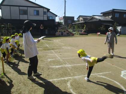 秋晴れの良い天気の中、秋の体力測定をしました。うさぎ組では、運動会が終わってからも「○○ちゃんより早く走りたい」「1位になりたい」と給食をモリモリ食べて、力をつけようとする姿が見られました。今日は、25m走、ボール投げ、立ち幅跳びに張り切って取り組みました。指導の先生から、立ち幅跳びでは腕を鳥の羽のように後ろに下げてから前に振るといいと教えてもらい、自分からそのポーズになって跳ぼうとしていましたよ。春の記録を上回る子が多く、測定している教師も力が入りました。