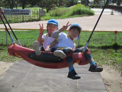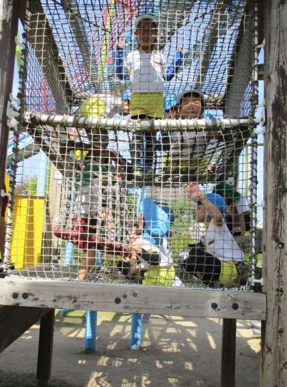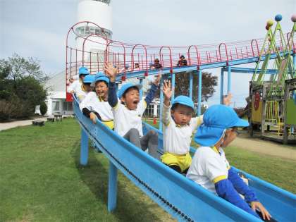 公園では、大型遊具のローラー滑り台やアスレチック、ターザンロープ等で遊びました。高さのある滑り台でしたが、みんなと滑れば笑顔いっぱい!何度もクラスみんなで電車のようにつながって滑りました。