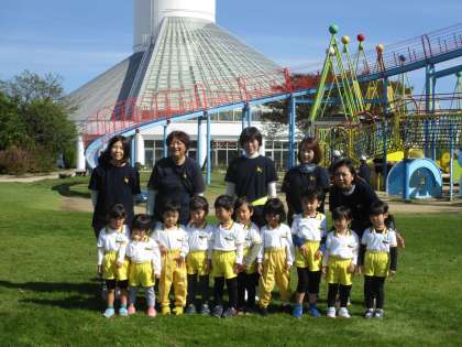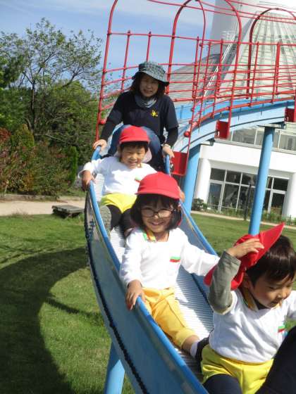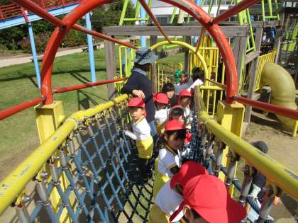 毎日「バスに乗りたい!」「遠足いきたい!」と楽しみにしていた子供たち。「春の遠足の時雨で行けなかった大きい公園だよ」と話すと「やった」と喜んでいました。バスに乗り込み、「まだかな、まだかな」とウキウキしている様子が伝わってきました。公園へ着くと大きな滑り台に早く遊びたくて足取りが軽くなっていました。アスレチックの網の渡るところではちょっとドキドキしながらもできたことに喜び、大きな滑り台は何度も楽しむ姿が見られました。