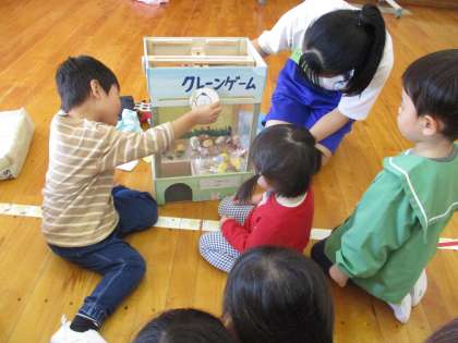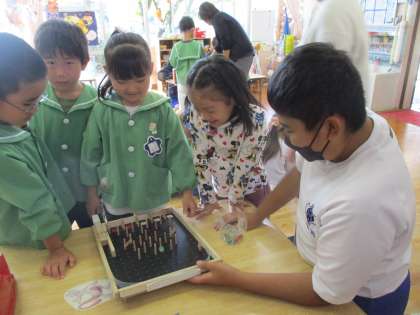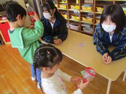 中学生のお兄さんお姉さんが来てくれました 3回目 公開日 2023/10/18 更新日 2023/10/18 今日のできごと 10月17日(火) 今日で3回目の交流会。子供たちも中学生のお兄さんお姉さんと手作りおもちゃで触れ合うことができました。優しく声をかけてもらったり、一緒に遊んだりと楽しい時間を過ごすことができました。子供たちは中学生が帰られた後も「楽しかった」とプレゼントされたおもちゃで遊びことを楽しんでいます。ありがとうございました。