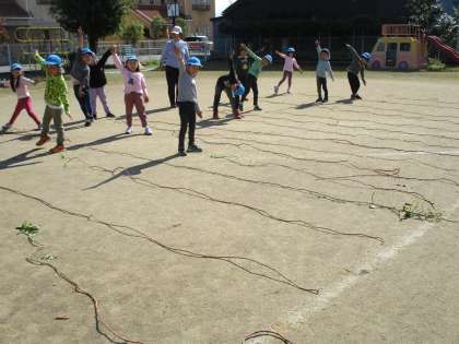 芋を掘った後は、ツルを使ってリースを作る為に葉っぱを取る作業をしました。“これが1番長い!”というツルを選び、みんなで長さ比べをしてみると、先生のツルよりも長い友達がいて驚きました。ツルを巻いて大きさも太さも違うリースの完成です。