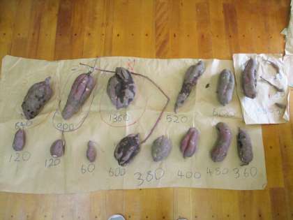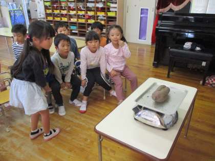「あのでっかい芋すごかったね」「私の持ったのも重かったよ」と言う声から、重さを比べてみることにしました。1番大きなもので1,360グラムもありました。小さなもので20〜60グラムと数字の大きさの違いから、重い、軽いを知ることができました。また、同じ重さなのに見た目のサイズが違っていて「同じなの!?」とビックリすることもあり、楽しい重さ比べでした。