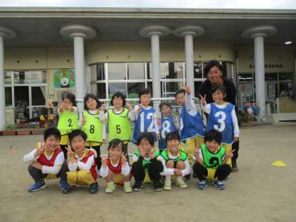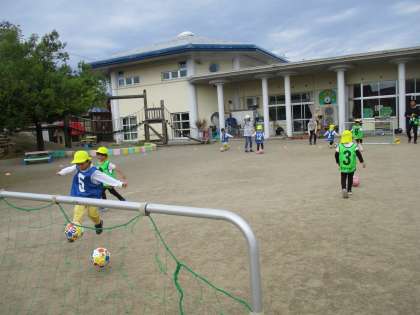 今日は、サッカー教室がありました。初めてサッカーをする子が多く、始まる前は「できるかな」「ドキドキする」と不安げな言葉が聞かれましたが、コーチの話をよく聞き積極的に取り組んでいました。最初は、コート内を友達にぶつからないように散歩し、慣れてくるとボールと一緒に散歩をしました。コートからボールが出ないように、力を調節して蹴る姿が見られ、「みんな上手だね!」とコーチに褒めてもらいました。また、ボールを足で止めたり、蹴るときのポイントを教えてもらったりし、初めてサッカーをする子も「できた!」「シューとが決まった!」と喜んでいました。最後に、試合も行いました。「楽しかった」「またやりたい」とサッカーが大好きになった子供たち。幼稚園でも、みんなでサッカーを楽しんでいきたいと思います。