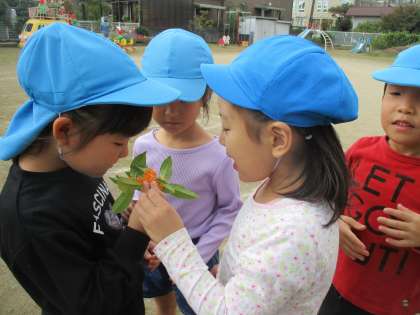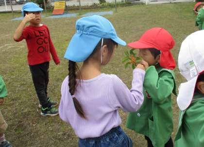 園庭で遊ぼうと外に出ると、いいにおいがしてきたので探していると「これかも!」と気付いた子どもたちです。少し枝を折って鼻の近くにもっていくと「すごいいいにおい!」「これ私の家の庭にもあるよ」「小さい花がいっぱい集まってるんだね」「小さい花一つだけじゃあまりにおいがしないよ」と思ったことや感じたことを口々に話していました。年少組さんにも教えてあげようと「いいにおいがするんだよ」と枝を見せて教えてあげていました。散歩の途中でもふっと香るいいにおいに癒されますね。探してみてくださいね。