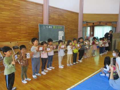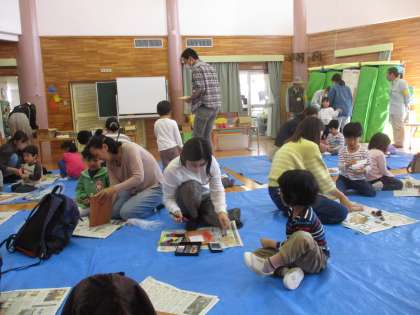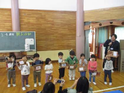 森の寺子屋事業で富山県フォレストリーダーさんが6名きてくださり、りす組・うさぎ組の親子活動を行いました。今回は、親子で自然物を使ったフォトフレームづくりをしました。講師の方が用意してくださった枝や木の実、葉っぱ等の自然物を見て、「どれを使う?」「この葉っぱきれいだね」「どこに写真をつける?」と親子一緒に考えていました。素敵な材料がたくさんあったので、子供たちも「これもつけたい」「どんぐりに色を塗る」とつくりたい意欲が高まっていました。お家の方も子供たちの思いを受け止めながら、どうやって枝をつけたらバランスよく立てられるかを考えたり、グルーガンのつけ方を工夫したりと一緒に工作を楽しんでいました。最後に、出来上がったフォトフレームをクラスごとに紹介しました。どの子も素敵な作品ができて、嬉しそうでした。おうちの方も、ご協力ありがとうございました。