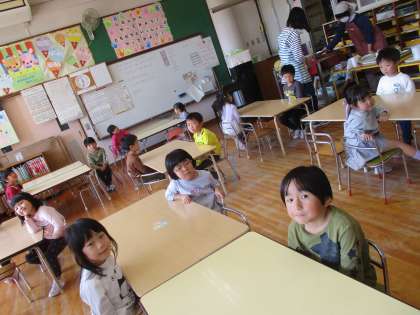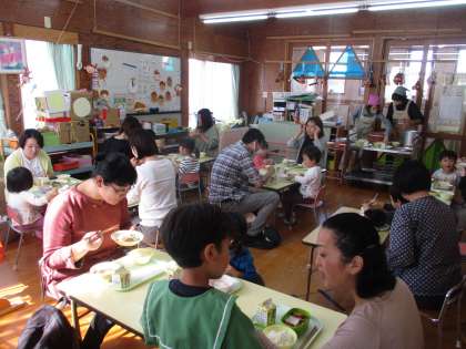 子供たちはいつも通り食事の準備をし、おうちの方がいつきてくれるかと心待ちにしていました。保護者の方々が遊戯室から保育室に入ってくると、隣に座ってもらい順番に配膳が始まりました。自分の食べられる量を先生に伝え調整してもらったり、お皿に盛り付けられている量を見て考えて選んだりします。我が子の隣で保護者の方も久しぶりに食べる『給食』を前に、懐かしくもあり美味しそうに食べる様子が印象的でした。途中に、調理員さんが食べている様子を見に来てくださると「美味しい味付けです」「食べやすいですね」と感想を伝えてくださいました。コロナ禍で数年間、開催できなかった給食試食会でしたが、今後も毎年開催できたら良いなと思いました。