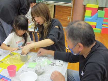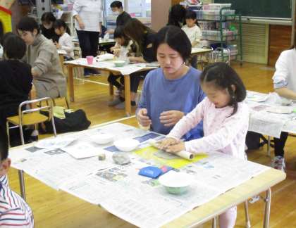 親子で三助焼体験をしました。三助焼窯元の5代目谷口均先生を講師に招き行いました。前もって、親子で作りたい物や描きたい物を考えて心待ちにしていました。谷口先生から作り方やポイントを教えてもらっていると、先生の技が気になりどんどん前のめりになってしまったくらい真剣でした。作り始めると「粘土、冷たい」「ヌルヌルだね」と親子でその感触を楽しみ、会話が弾んでいました。お家の方と力を合わせて、皿や小鉢、マグカップや湯呑など素敵な作品ができましたね。焼き上がりは12月の予定です。どんな作品が完成するか楽しみですね。