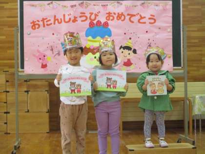 10月の誕生会をしました。拍手の中、誕生児が入場し、お友達にお祝いしてもらいました。質問コーナーでは「好きな動物は何ですか?」という質問に、誕生児3人とも「ウサギです」と答え、「えーっ!」「みんなウサギ好きなんだね」「私も好き」と話をする子供たちでした。少し緊張した様子も見られましたが、嬉しそうに答えることができました。