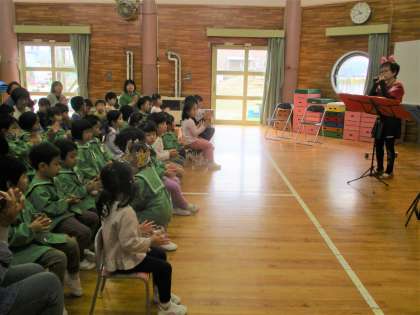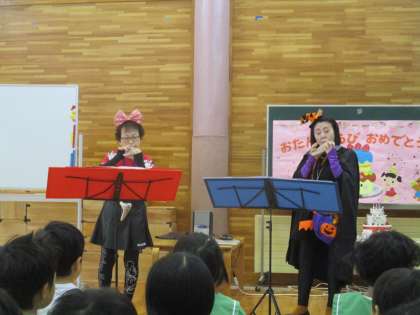 お楽しみコーナーでは明日のハロウィンにちなんで、ミニーちゃんと魔女の仮装をした「まーちゃんとみーちゃん」による、オカリナ演奏を聴きました。ディズニーやジブリ、アンパンマンの曲を聞かせてもらい、口ずさんだり手拍子をしたりして楽しみました。素敵な音色に、聞き入っている子供たちでした。