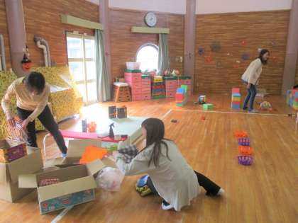 明日はPTA秋祭りです。これまで何日もかけてPTA役員さんが集まり、企画を考え準備を進めてきてくださいました。前日の今日は、幼稚園の遊戯室に写真ブースや楽しいコーナーを準備してくださっています。