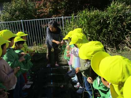 今日はお天気も良く、昨日買ってきた玉ねぎの苗を、みんなで植えました。幼稚園にあった絵本『ごろりんたまねぎ』を読み、細い小さな苗から玉ねぎに育っていく様子を見ました。苗は全部で50本買ってきたので、一人あたり約3本植えました。明日から水やりをしながら成長を楽しみに、クラスで観察していきたいと思います。
