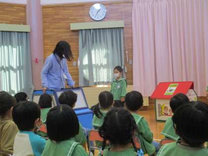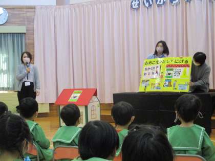 今日は、富山県防犯協会からこども安全サポーターの方が3名来園され「こども防犯教室」がありました。自分の身を守るためには「ひとりにならない」「大声を出す」「ついていかない」と3つの約束を教えてもらいました。年長の代表の友達が、声をかけられた時にどうしたら良いか実際に練習しました。お菓子をもらえるといわれても「いりません!」と言ったり、おうちの人が病院にいるからおいでと誘われても「行きません!」とはっきり断っており、見ていた子供達や先生達も「上手に断ることができたね」と拍手を送っていました。また、何かあった際には「子ども110番の家」に逃げたり、近くの大人に助けを求めたりすることも大切ですよと教えてもらいました。皆さんの家の近くにもある「子ども110番の家」やお店などを、家族みんなで確認してみるのもよいですね!
