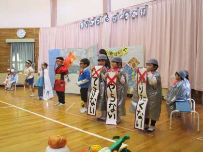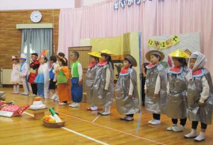 「劇」は「かさじぞう」の話の途中を創作し演じました。子供たちのアイディアと、それぞれが役になりきった演技が見られ、お客さんが楽しんでいる様子を見た子供たちは更にはりきっていました。“自分たちの考えた話が見ている人に伝わること”は、ずっと目標にしてきたことなので、笑って見てもらえたことは本当に嬉しかったと思います。