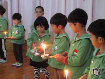 キャンドルサービスをしました。ぞう組の子供たちは、「いろんなことに挑戦します」「友達や家族にありがとうやごめんなさいを伝えます」とこれから守る約束を神様に伝え、ロウソクの火を園長先生より分けてもらいました。みんなの持っているロウソクに火が灯り集まると、温かい光に包まれとても神聖な気持ちになりました。りす組やうさぎ組さんも一緒に願いを込めていました。