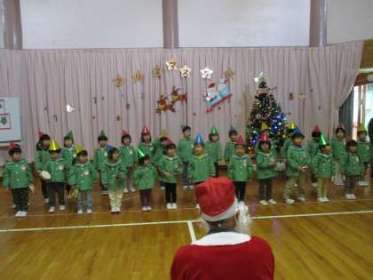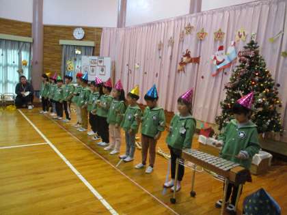 プレゼントをもらったお礼にサンタさんに「あわてんぼうのサンタクロース」の曲の打楽器奏をりす組とうさぎ組さんで披露し、ぞう組はハンドベルで「きらきら星」、鍵盤ハーモニカで「ドレミの歌」を演奏しました。サンタさんはニコニコとされ、喜んでもらえたようです。最後にサンタさんが帰るときには「今度は私、ぼくの家に来てね」と声をかけ手を振ってお別れをしました。