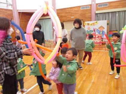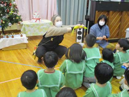 お楽しみ会では、昨年度の卒園生の保護者の方2名にバルーンパフォーマンスをしていただきました。細長い風船がいろいろな形に変わっていく様子に「あっ!お花だ」「すごーい!」と視線が釘付けの子供たちでした。パフォーマンスの後は、バルーンを飛ばして的あてをして遊んだり、ぴょんぴょんネズミの作り方を教えてもらったりして、楽しい時間となりました。また、一人ずつバルーンでつくったサンタさんをプレゼントでもらい、嬉しそうな子供たちでした。お家で飾ってくださいね。