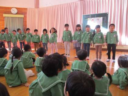 3学期の始業式をしました。「あけましておめでとうございます」と元気な子供達とのあいさつから始まり、園長先生からは、「冬休みでは『は・や・ほ・し」』の約束を守り、楽しくお正月を過ごしましたか?」と聞かれると「はい!」としっかり返事をする子供たちでした。「3学期は3ヶ月の間にいろいろな行事があり、年長さんは小学1年生に、年中・年少さんは1つ大きい組さんになるための準備もしていきましょう」と話をしました。その後、3学期に頑張りたいことをそれぞれの学年で発表しました。年長さんは一人ずつ自分で考えた頑張りたいことをしっかりみんなの前で発表し、自分の言葉で伝えようとする顔がとても頼もしく見えました。
