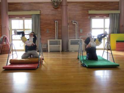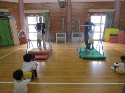 今日は鉄棒を教えてもらいました。「けんすい」では大きな声で10秒数えてぶら下がり、落ちないように力の入った子供たちの顔が見られました。新しい技では「ブタのまるやき」「足掛け・腰抜き回り」に挑戦し、手本の友達を見て「できるかな」と不安そうな子もいましたが、実際にやってみると「できた」と喜んでいました。最後に、体操教室の先生の補助のもと、鉄棒に立つ技を教えてもらい「すごーい、楽しかった」「高かったけど面白い」と満足そうな様子の子供たちでした。