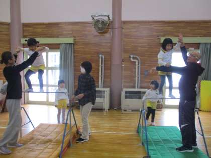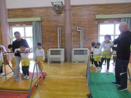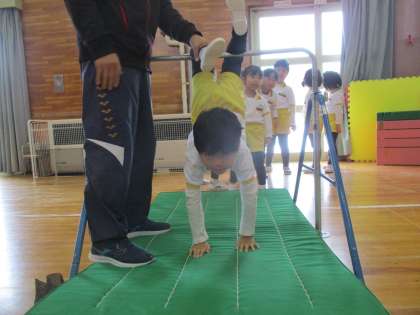 新しい年になり、久しぶりの体操教室では鉄棒をしました。豚の丸焼きは自分でできる子が多く「1・2・3…」と、元気いっぱいに数を数えることができました。そのあと、足抜き回り・腰抜き回りや、ツバメから前回り降り、コウモリで手をついて降りる技にも挑戦しました。「ツバメは手をまっすぐに伸ばすと、鉄棒がおなかに当たらないから痛くないよ」と先生に教えてもらい、腕を意識して取り組む子供たちでした。体の使い方や、どこに足をかければいいかを繰り返し練習する中で、身に付けていきたいと思っています。足抜き回り・腰抜き回りはご家庭でも、親子で触れ合いながらできるので、ぜひやってみてくださいね!