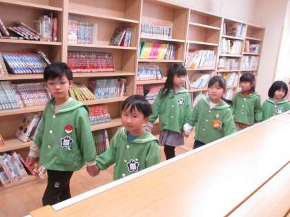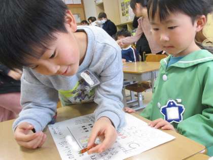 4月に速星小学校に入学する予定の友達と一緒に速星小学校へ体験学習に行ってきました。1年生の教室では、お兄さんやお姉さんに囲まれ、教えてもらいながら算数の勉強をしました。うまく書けたら1年生さんがハナマルを付けてくれました。(写真:中 昨年のぞう組の友達にごほうびシールを貼ってもらっています)