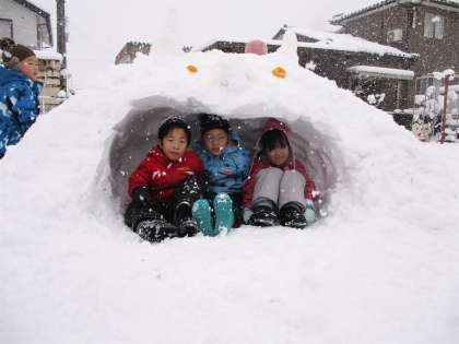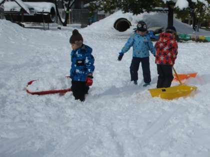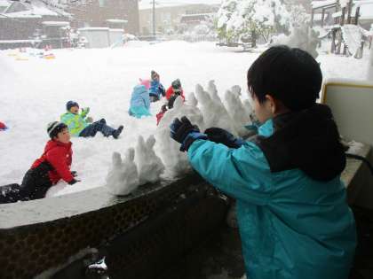 昨日、作ったかまくらが少し小さかったことから「もっと大きいかまくらにしよう!」と、クラスみんなでかまくら作りをスタートしました。そりに雪を集めてくる友達、それをバンバンと固める友達と役割を分担すると「はい、雪もってきました」と言う声に「ありがとう、こっちにお願い」と応え、どんどん大きくなっていきました。昨日の穴より大きく深くなったことで「3人は入れたけど、4人はちょっとせまいね」「おしりも頭も隠れた〜」と喜び合いました。かまくらの中で寝転がったり、かまくらの中の特有の音を感じたりしていた子供たちです。かまくらがトトロみたくなったことからミニトトロ作りもしました。それぞれのトトロがたくさん並んで可愛かったです。