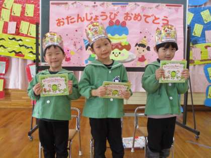 今日は、1月生まれの友達の誕生会がありました。誕生児の3人の友達は、少し照れながらも友達や先生にハイタッチして入場していました。質問コーナーでは好きな食べ物や好きなポケモンを聞かれ、よく考えて答えることができました。