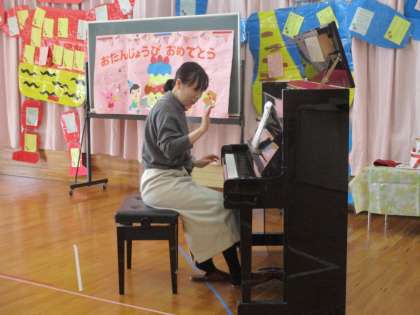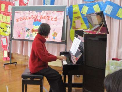 お楽しみコーナーは、今月は「ピアノ演奏」でした。映画ドラえもんの主題歌「虹」や「let it go」は、よく知っている曲なので一緒に歌う子も多かったです。譜面台に広げられた楽譜の長さにびっくりして「あんなに長いの!?」と驚いていた子もいました。また、明るい長調の曲を、悲しく感じる短調に変調して演奏されクイズだ出されると「え?これ豆まきの歌?」「不思議〜!」と身近な曲なのに、伴奏が変わると不思議な感覚を味わう時間になりました。講師の先生方、貴重なお時間をありがとうございました。