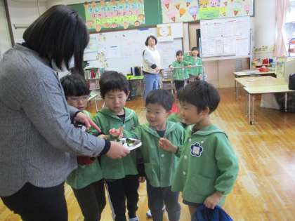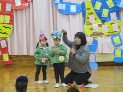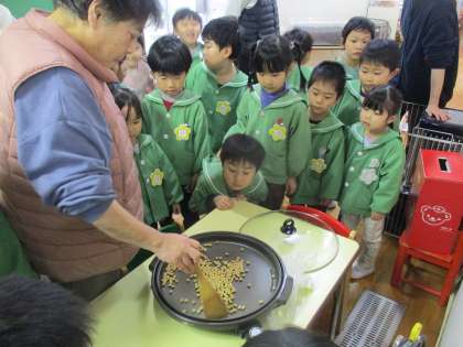 2月3日は節分です。幼稚園では「春を待つ子供会」をしました。「何かの匂いがする」と登園してきた子供たち。匂いの正体は、イワシや炒った豆のにおいでした。先生から聞いた話を思い出し、「これ、鬼が嫌いなやつだね」「いい匂いなのにどうして鬼さんは嫌いなのかな」「これで鬼さん来ないね」と言っていました。その後、遊戯室に行き、みんなで豆まきの歌を歌ったり紙芝居を見たりしました。