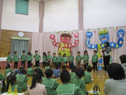各クラスの代表の友達が鬼のお面をつくるときに楽しかったことや頑張ったところを発表し合いました。「心の中の追い出したい鬼」の発表では、友達の話を聞いて「○○ちゃんは優しいのに、そんな一面もあるんだ」と新たな一面を知ったり「お菓子ばっかり食べて虫歯になるなんて嫌だね」と共感したりして、自分も悪い心の鬼を追い出そうという気持ちが高まりました。「鬼は外!福は内!」と力強く豆を投げ、心の中の鬼を追い払う子供たちでした。