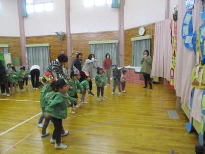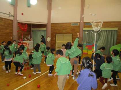 節分の玉入れゲームをして、楽しく豆まき会が終わるかと思ったとき…どこからか「ドンドンドン」と太鼓の音が聞こえてきて、赤鬼と青鬼が幼稚園に入ってきました。突然の登場に驚き、先生の後ろに隠れたり泣いたりする姿も見られましたが、勇気を振り絞って豆を投げたり大きな声を出して、赤鬼と青鬼も追い出すことができました。